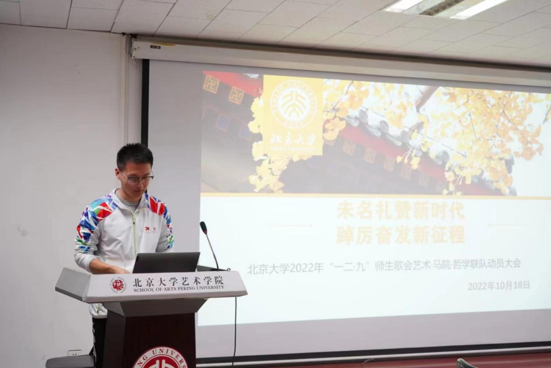 2022年10月18日晚,北京大学艺术学院、马克思主义学院、哲学系联队的2022级新生爱乐传习项目暨“一二·九”师生歌会动员大会于理科五号楼438室举办。动员会由哲学系团委副书记邓凯达主持。