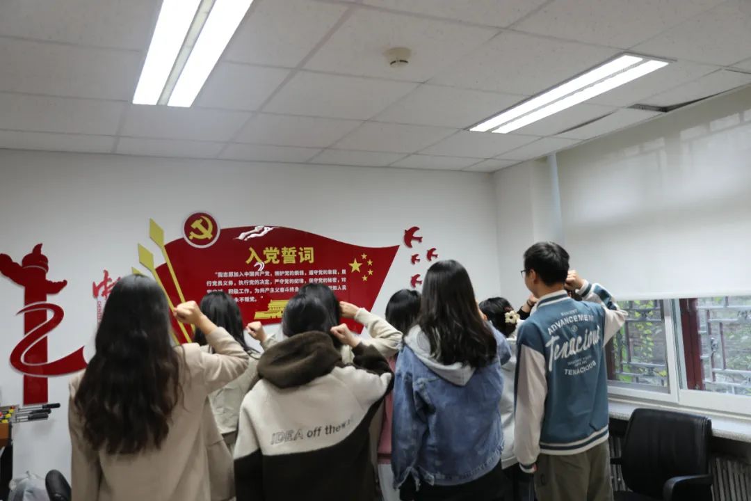 党支部委员胡月月对各位预备党员表示祝贺,并为他们发放了党徽,希望他们能以党员的标准严格要求自己,积极参加支部活动,重视专业理论知识与社会实践的结合,做到学以致用、知行合一。随后党支部委员王宇轩带领预备党员进行了入党宣誓。