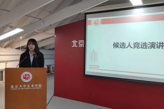 大会第五项,候选人竞选演讲。艺术学院学生会常代表于小航宣读了北京大学艺术学院第二十二届学生代表大会选举办法。四位候选人按照抽签的顺序依次进行了竞选演说,并接受了学生代表的提问。演讲顺序为朱姝洁、元婧钰、董晴晴、王舒扬。