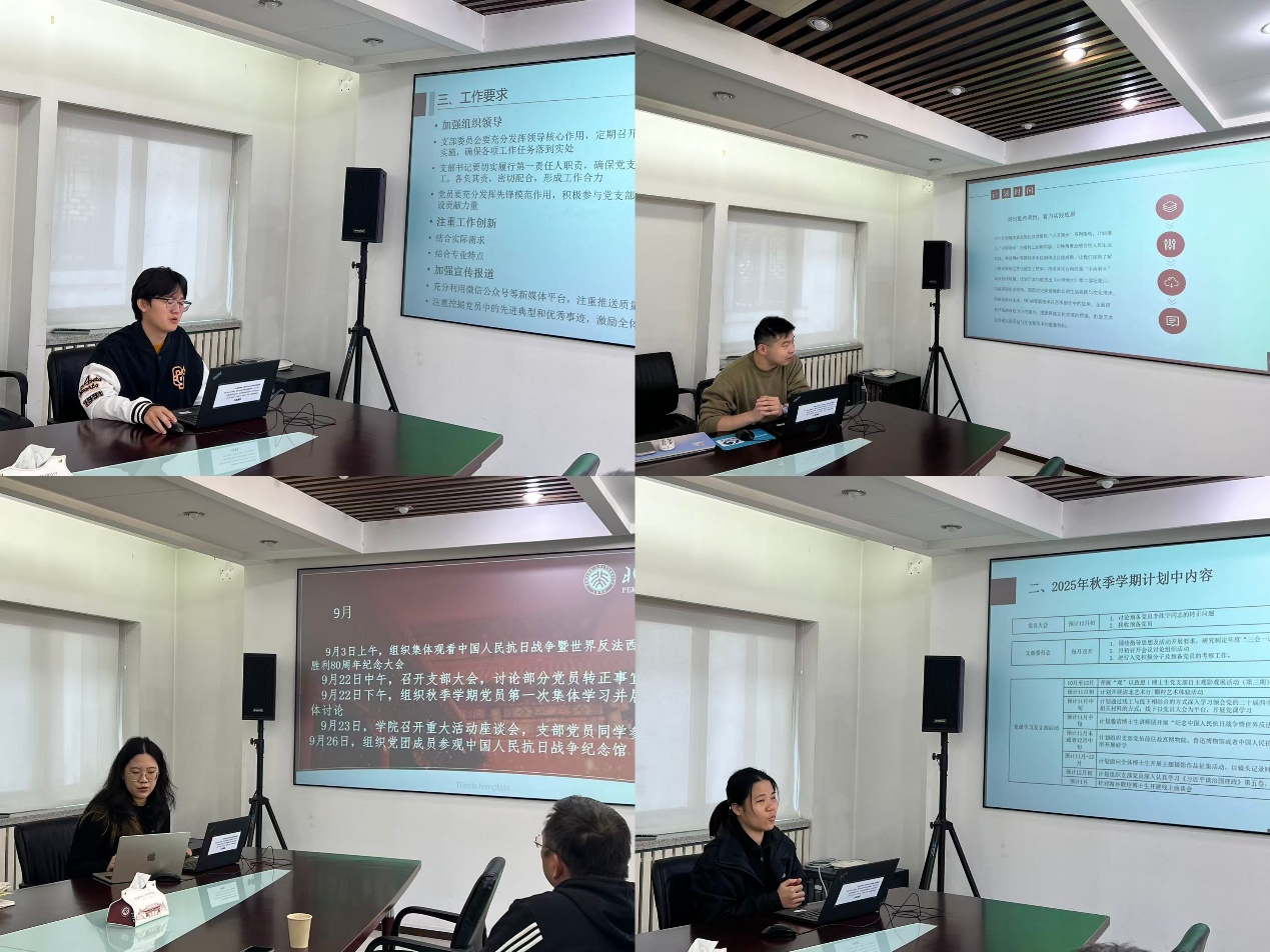 随后,各支部书记围绕本支部工作进行了深入交流。本科生联合党支部围绕学习贯彻全会精神、加强组织建设、丰富活动与社会实践、强化宣传阵地建设推进工作,营造团结奋进的支部氛围。非全日制硕士生联合党支部聚焦全会精神与“科技创新年”主题,计划开展“艺术服务人民”社区乡村实践,深化“弥渡采风——《小河淌水》”项目,以点映、沙龙等拓展视野、促进理实融合。全日制硕士生联合党支部以全会精神为指引,重点打造“歌唱里的红色青春”主题音乐会,用歌剧演绎结合精神阐释,形成特色美育党建品牌。博士生党支部立足“党建引领科研创新”,计划开展全会精神等系列理论学习,推进“清北艺术行”联学共建、“观”以致思——观影观展活动,探索学科交叉融合,发挥博士党员引领示范作用。
